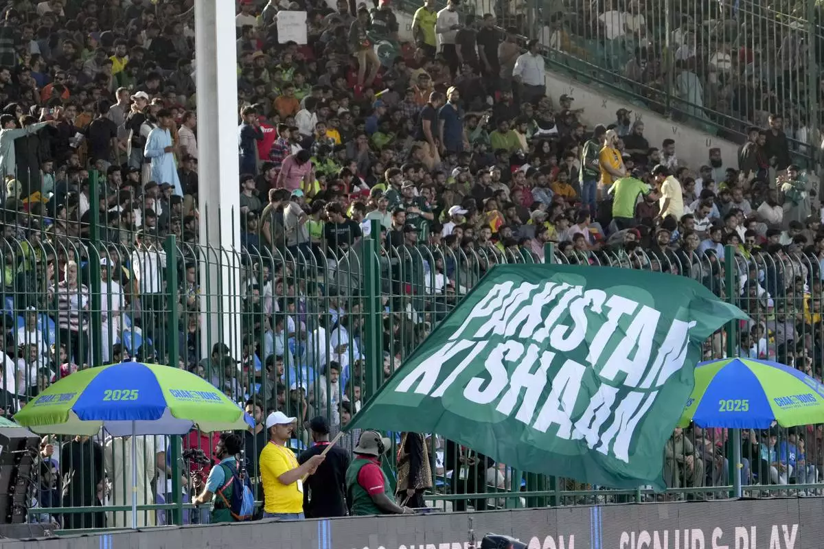 Fans cheer during the ICC Champions Trophy cricket match between Pakistan and New Zealand, in Karachi, Pakistan Wednesday, Feb. 19, 2025. (AP Photo/Fareed Khan)