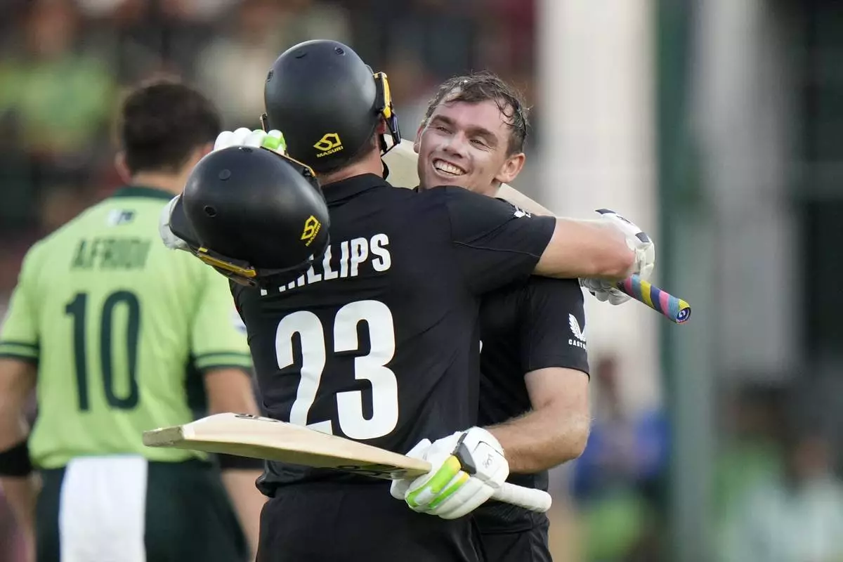 New Zealand's Tom Latham, right, celebrates with Glenn Phillips after scoring century during the ICC Champions Trophy cricket match between Pakistan and New Zealand, in Karachi, Pakistan Wednesday, Feb. 19, 2025. (AP Photo/Anjum Naveed)