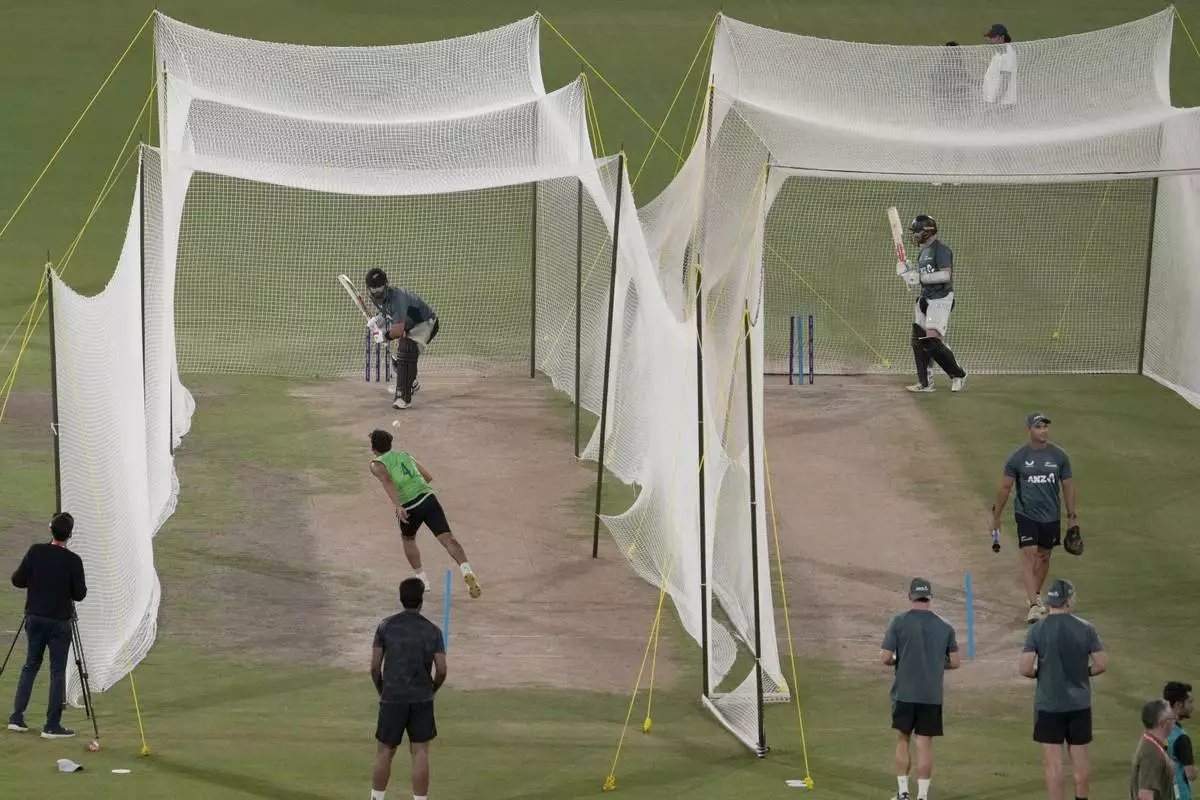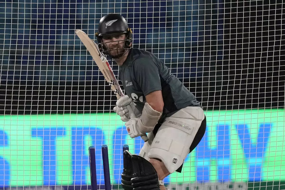 New Zealand's Kane Williamson attends a practice session for the ICC Champions Trophy, in Karachi, Pakistan Tuesday, Feb. 18, 2025. (AP Photo/Fareed Khan)