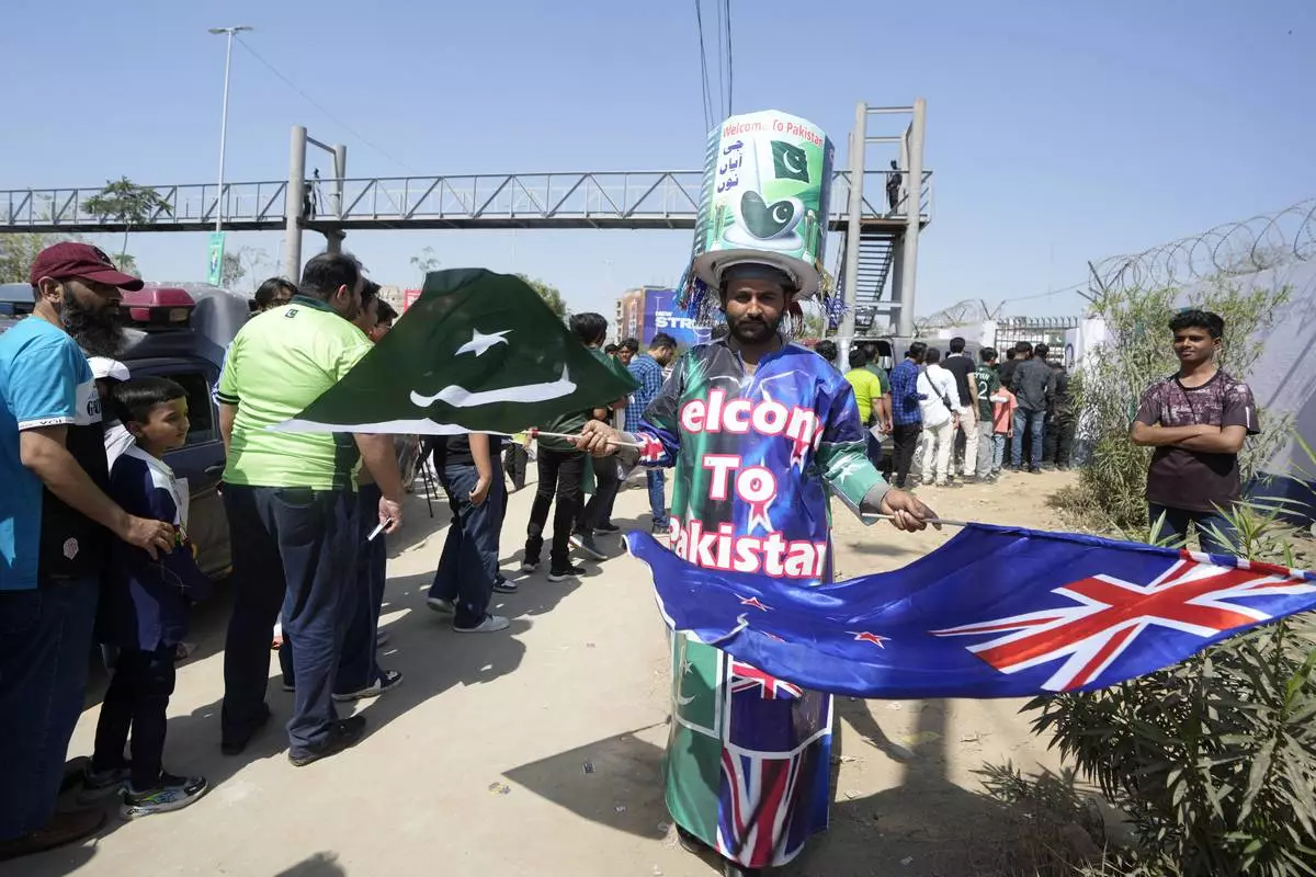 A fan waves Pakistan and New Zealand flags as other passing through a security checkpoint to enter in the National Bank Stadium for the ICC Champions Trophy cricket match between Pakistan and New Zealand, in Karachi, Pakistan Wednesday, Feb. 19, 2025. (AP Photo/Fareed Khan)