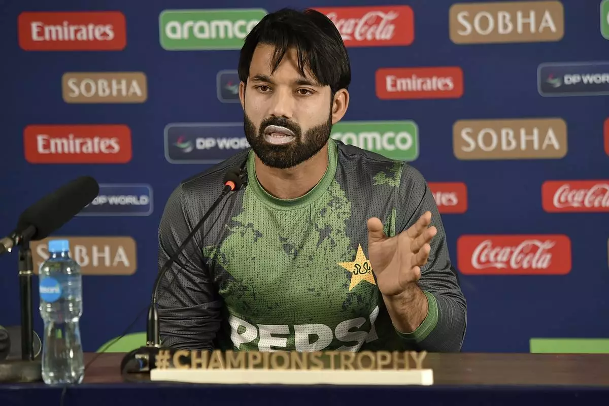 Pakistan's skipper Mohammad Rizwan speaks during a press conference regarding the ICC Champions Trophy, in Karachi, Pakistan Tuesday, Feb. 18, 2025. (AP Photo/Fareed Khan)