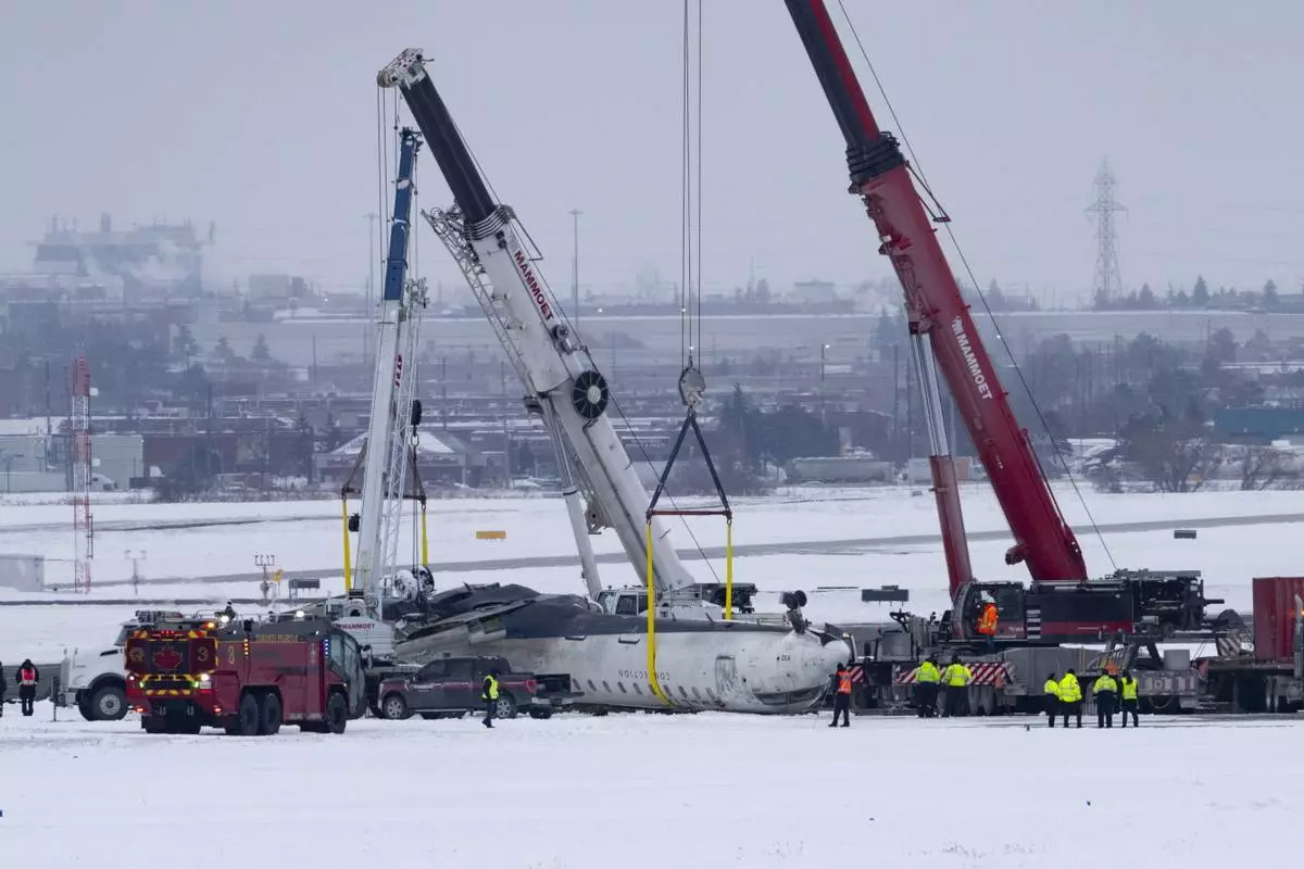 This image taken from video provided by CTV shows a crane lifting debris of a plane at Toronto Pearson Airport on Wednesday, Feb.19, 2025. (CTV via AP)