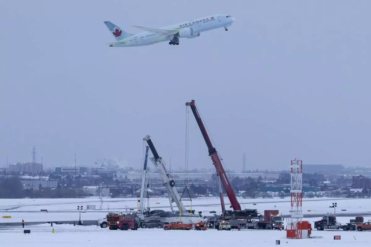 An Air Canada flight takes off in the background as cranes are positioned to remove the wreckage of Delta Flight 4819 from the runway at Toronto Pearson International Airport, in Mississauga, Ontario, on Wednesday, Feb. 19, 2025. (Arlyn McAdorey/The Canadian Press via AP)