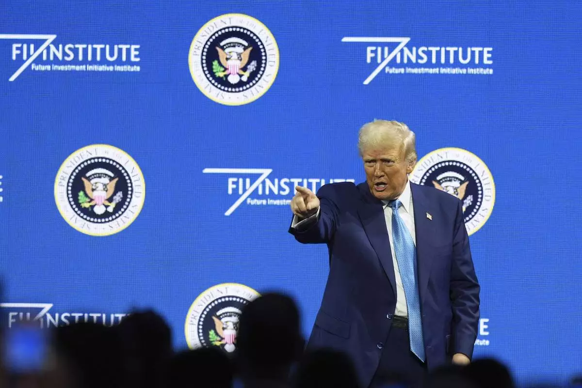 President Donald Trump gestures at the Future Investment Initiative (FII) Institute summit in Miami Beach, Fla., Wednesday, Feb. 19, 2025. (AP Photo/Rebecca Blackwell)