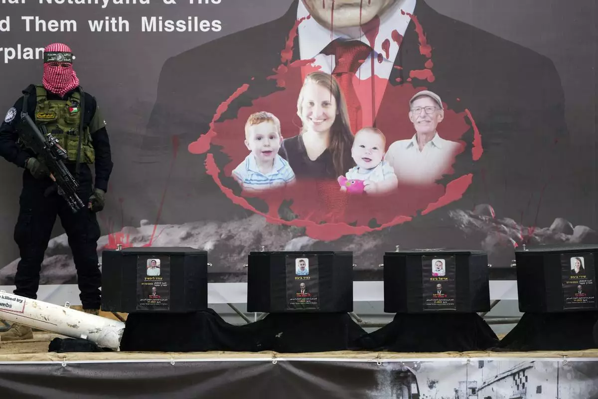 On Thursday, over 16 months later, Hamas militants displayed coffins on a stage labeled with Shiri's name and those of her two boys. Behind them hung a panel where their pictures hovered beneath a cartoon of a vampiric-looking Netanyahu.