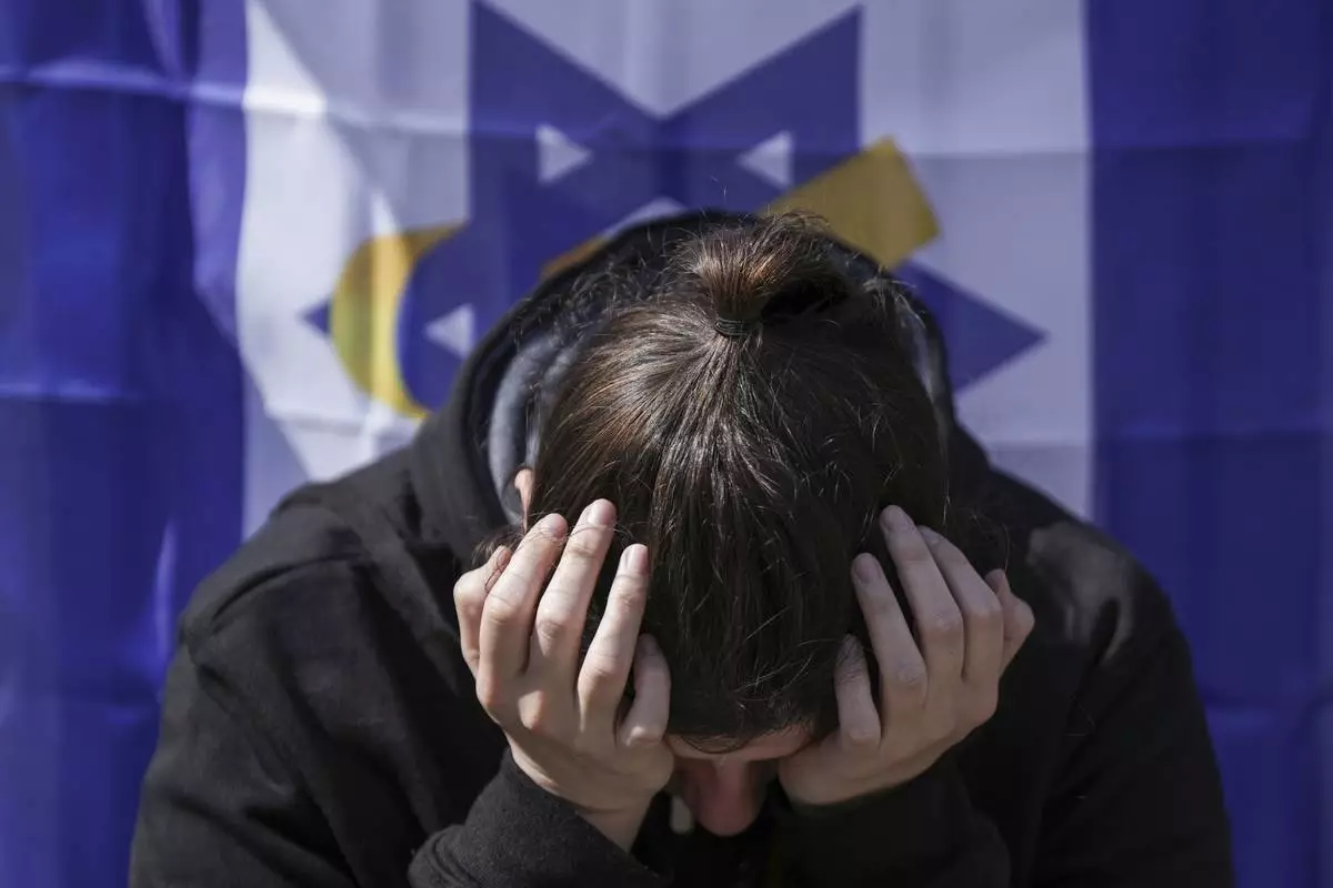 A woman reacts at the so-called 'Hostages Square' in Tel Aviv, Israel, Thursday, Feb. 20, 2025, as the bodies of four Israeli hostages, including a mother and her two children, are handed over by Hamas to the Red Cross in Gaza. (AP Photo/Oded Balilty)