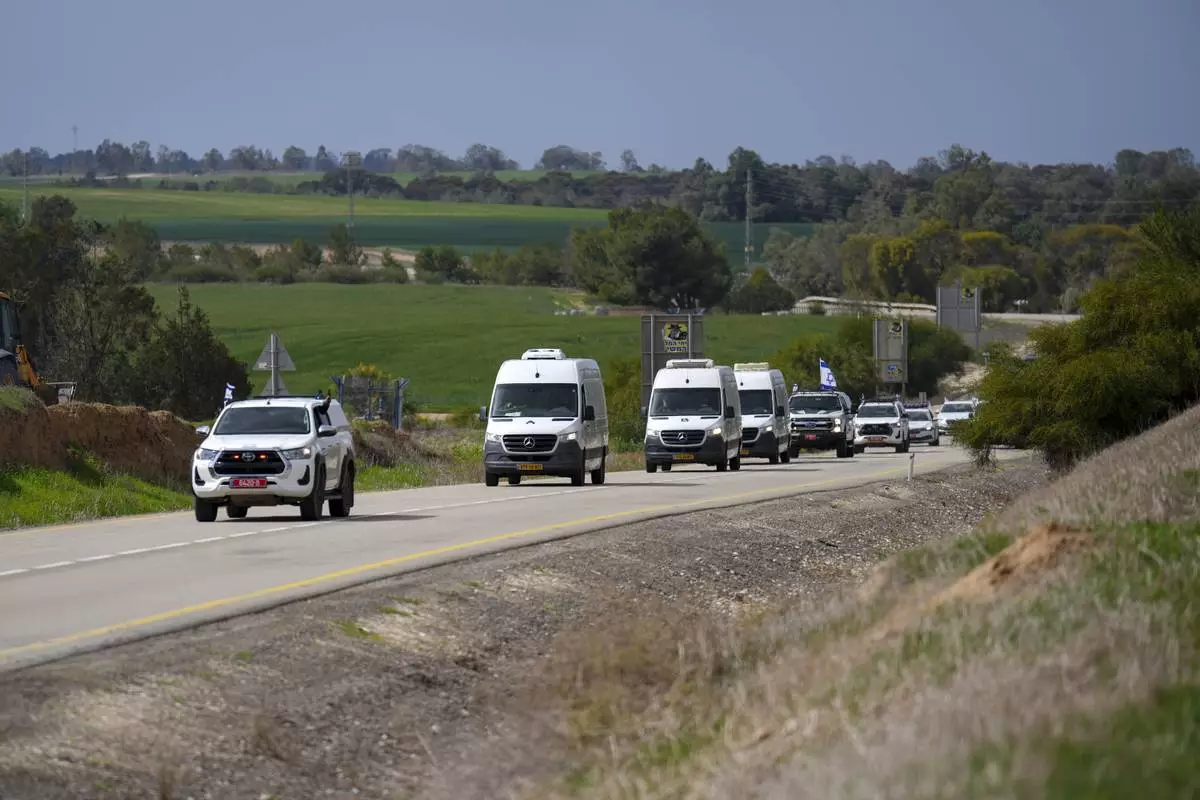 A convoy carrying the coffins containing the bodies of four Israeli hostages, including a mother and her two children, handed over by Palestinian militant groups in Gaza, drives by a road near Kibbutz Reim, southern Israel, Thursday, Feb. 20, 2025.(AP Photo/Ariel Schalit)