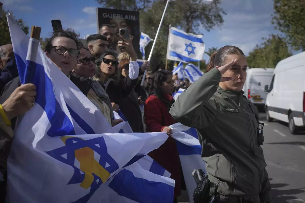 An Israeli border policewoman salutes as a convoy carrying the coffins of four Israeli hostages, including a mother and her two children, arrives at the Abu Kabir Forensic Institute in Tel Aviv, Israel, Thursday Feb. 20, 2025 after the bodies were handed over by Palestinian militant groups in Gaza.(AP Photo/Ohad Zwigenberg)