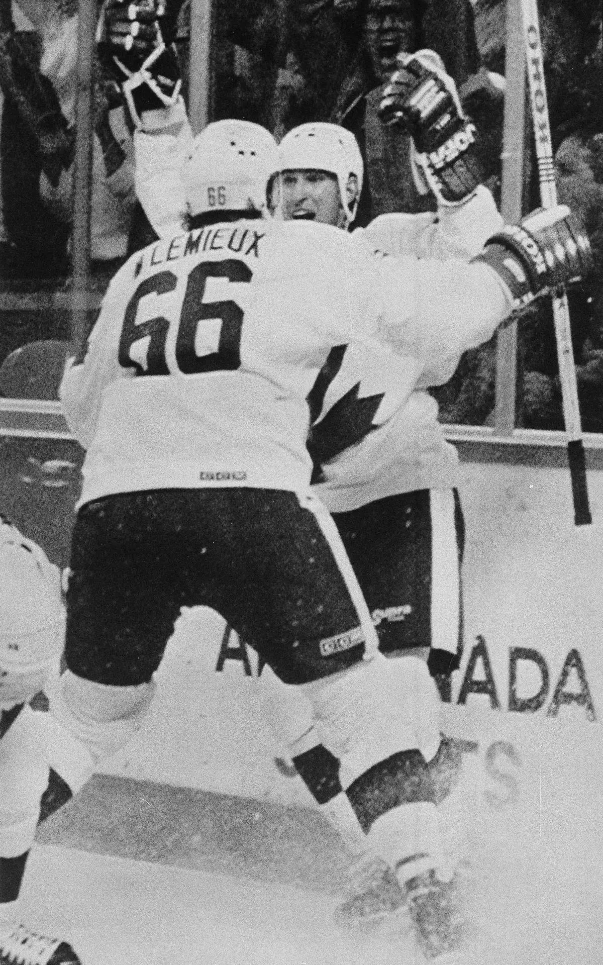 FILE - Canada's Mario Lemieux rushes into the arms of teammate Wayne Gretzky after Gretzky scored the game-winner in their Canada Cup final match against the Soviet Union, Sept. 15, 1987, in Hamilton, Ontario. (AP Photo/Blaise Edwards, File)