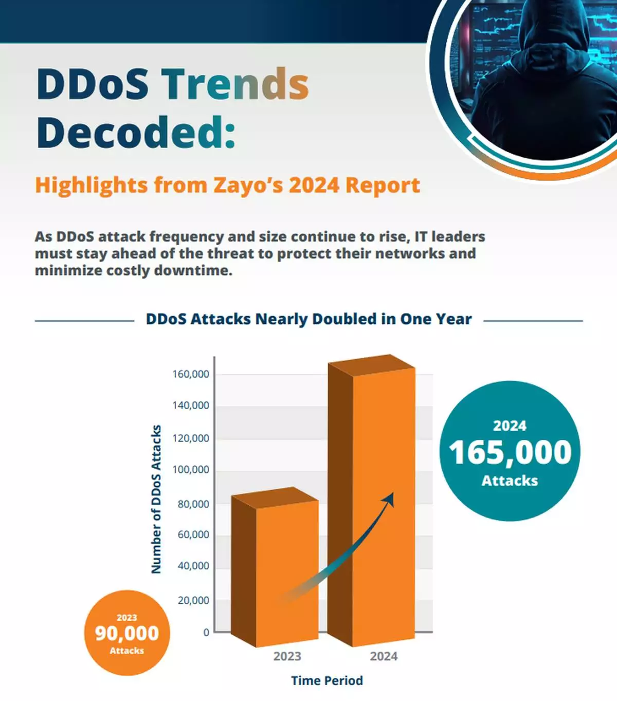 Zayo Group, a leading global communications infrastructure provider, today released its biannual Distributed Denial of Service (DDoS) Insights Report, revealing a nearly 82% surge in attack frequency between 2023 and 2024. Attack volume almost doubled from 90,000 incidents in 2023 to 165,000 in 2024, as cybercriminals leverage AI and expanding adoption of IoT devices to launch faster, more persistent, and more complex attacks.