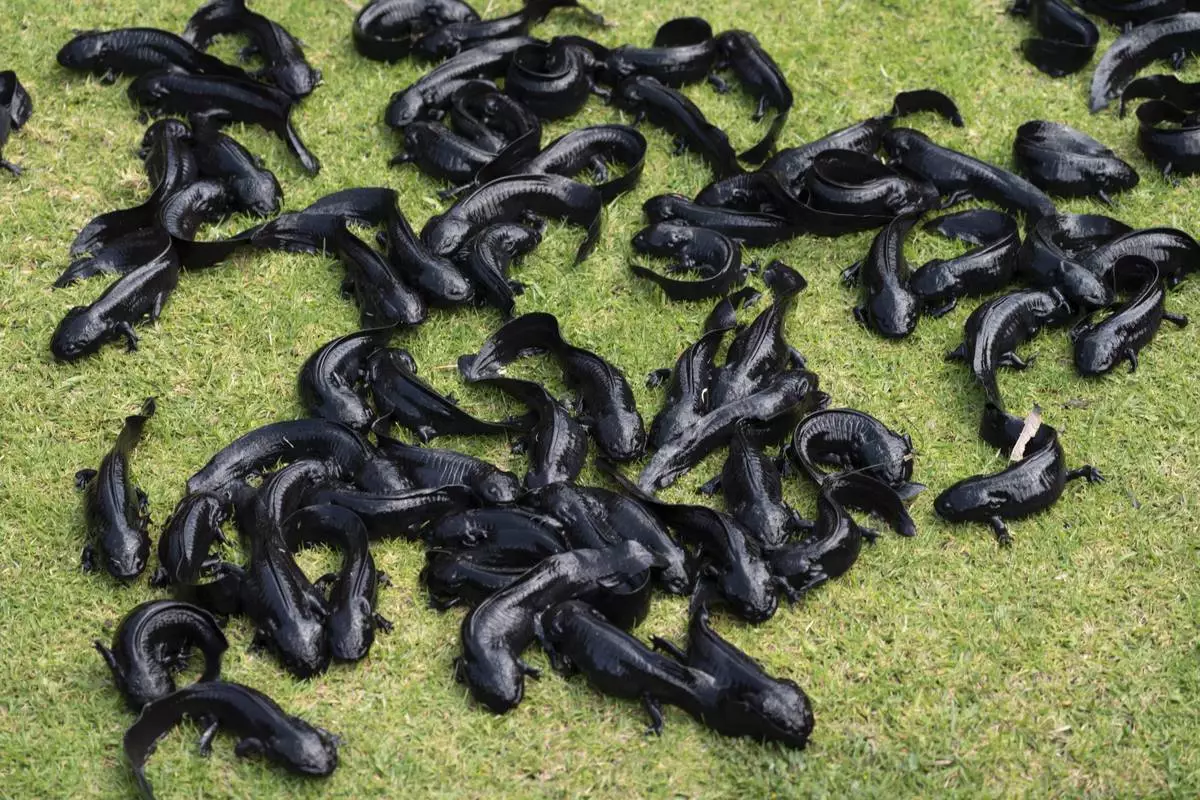 Axolotls scurry around during a media presentation before their release into the canals of Xochimilco, a borough of Mexico City, Wednesday, Feb. 16, 2022. (AP Photo/Marco Ugarte)