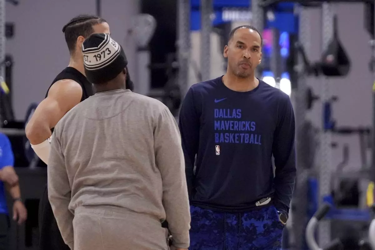 Dallas Mavericks head coach Jason Kidd responds to questions during a news conference after an NBA basketball practice at the team's training facility in Dallas, Thursday, Feb. 20, 2025. (AP Photo/Tony Gutierrez)