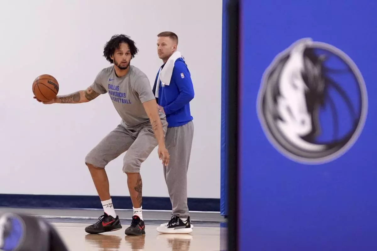 Dallas Mavericks' Dereck Lively II, left, who is recovering from injury works with assistant coach Sean Sweeney, right, at the end of NBA basketball practice at the team's training facility in Dallas, Thursday, Feb. 20, 2025. (AP Photo/Tony Gutierrez)