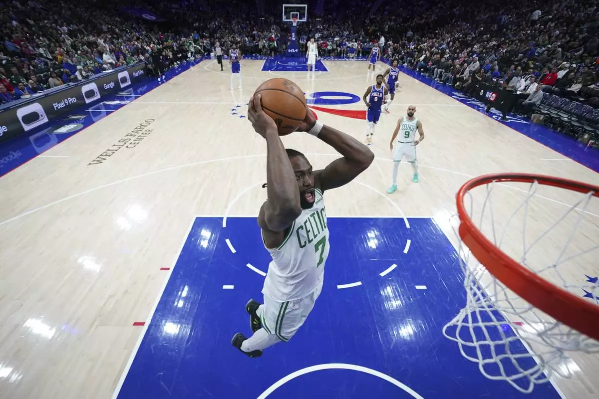 Boston Celtics' Jaylen Brown goes up for a dunk during the second half of an NBA basketball game against the Philadelphia 76ers, Thursday, Feb. 20, 2025, in Philadelphia. (AP Photo/Matt Slocum)