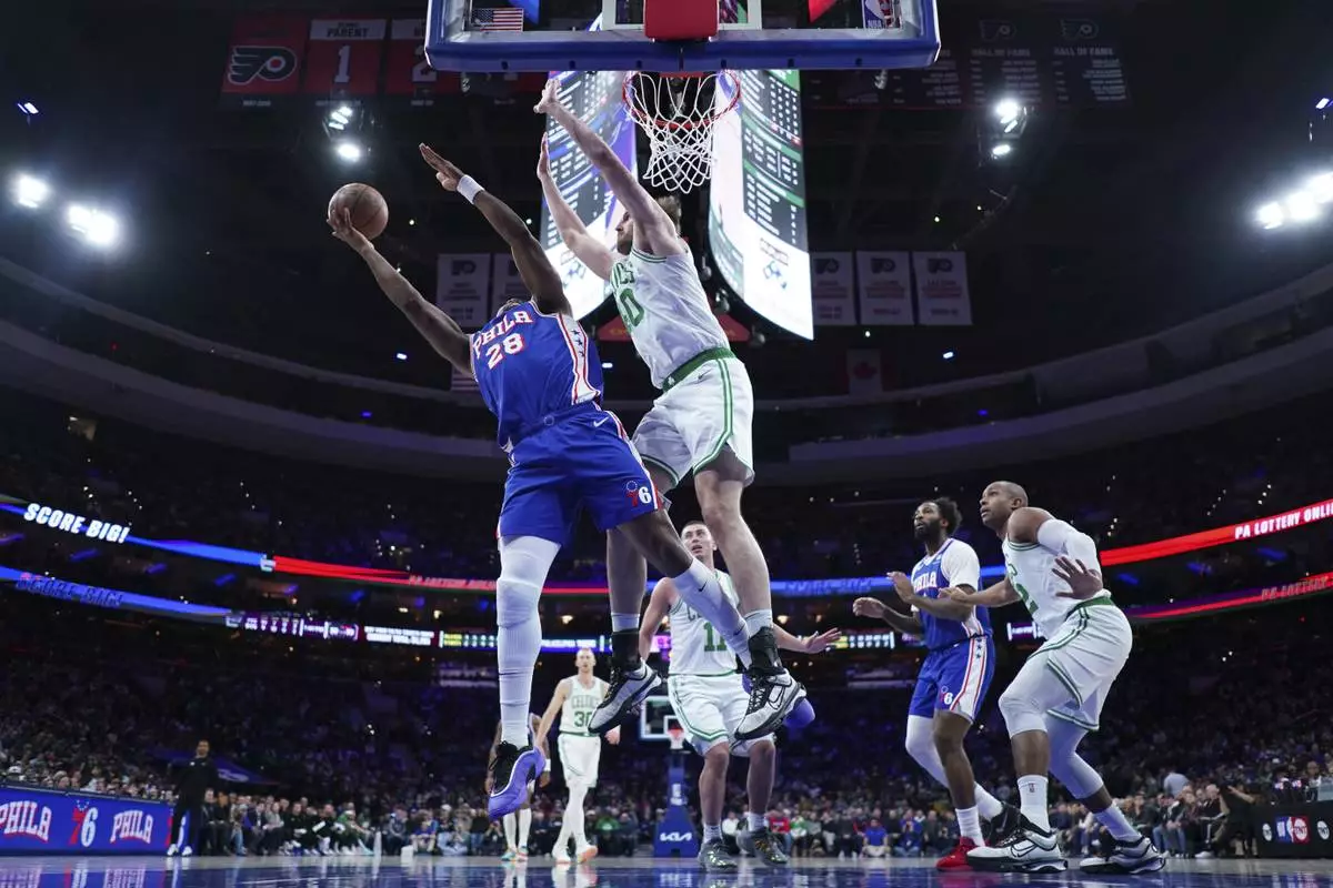 Philadelphia 76ers' Guerschon Yabusele, left, goes up for a shot against Boston Celtics' Luke Kornet during the first half of an NBA basketball game, Thursday, Feb. 20, 2025, in Philadelphia. (AP Photo/Matt Slocum)