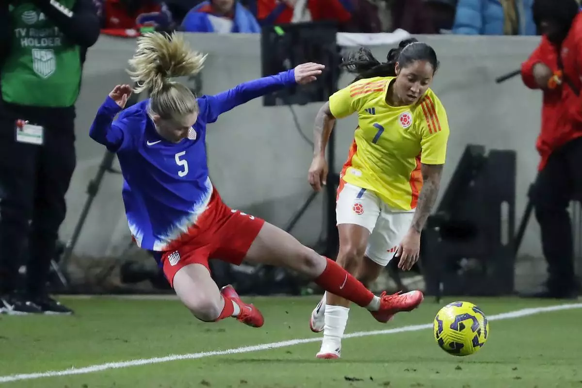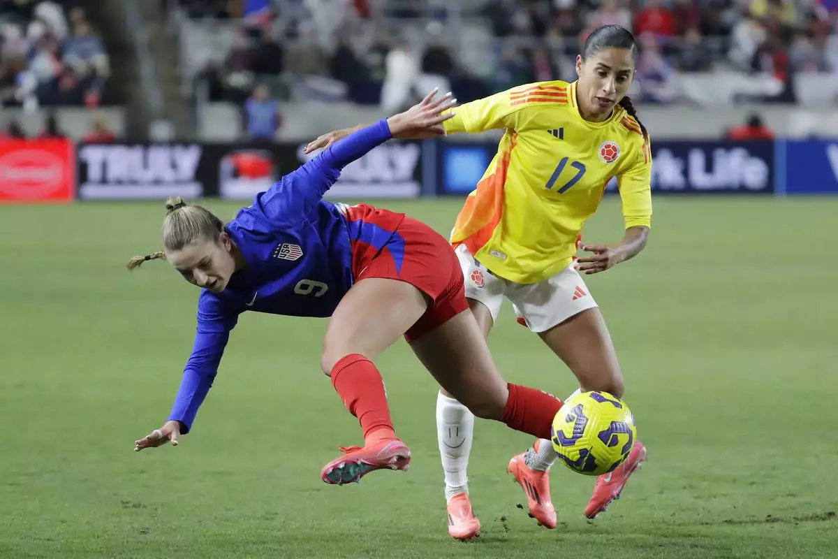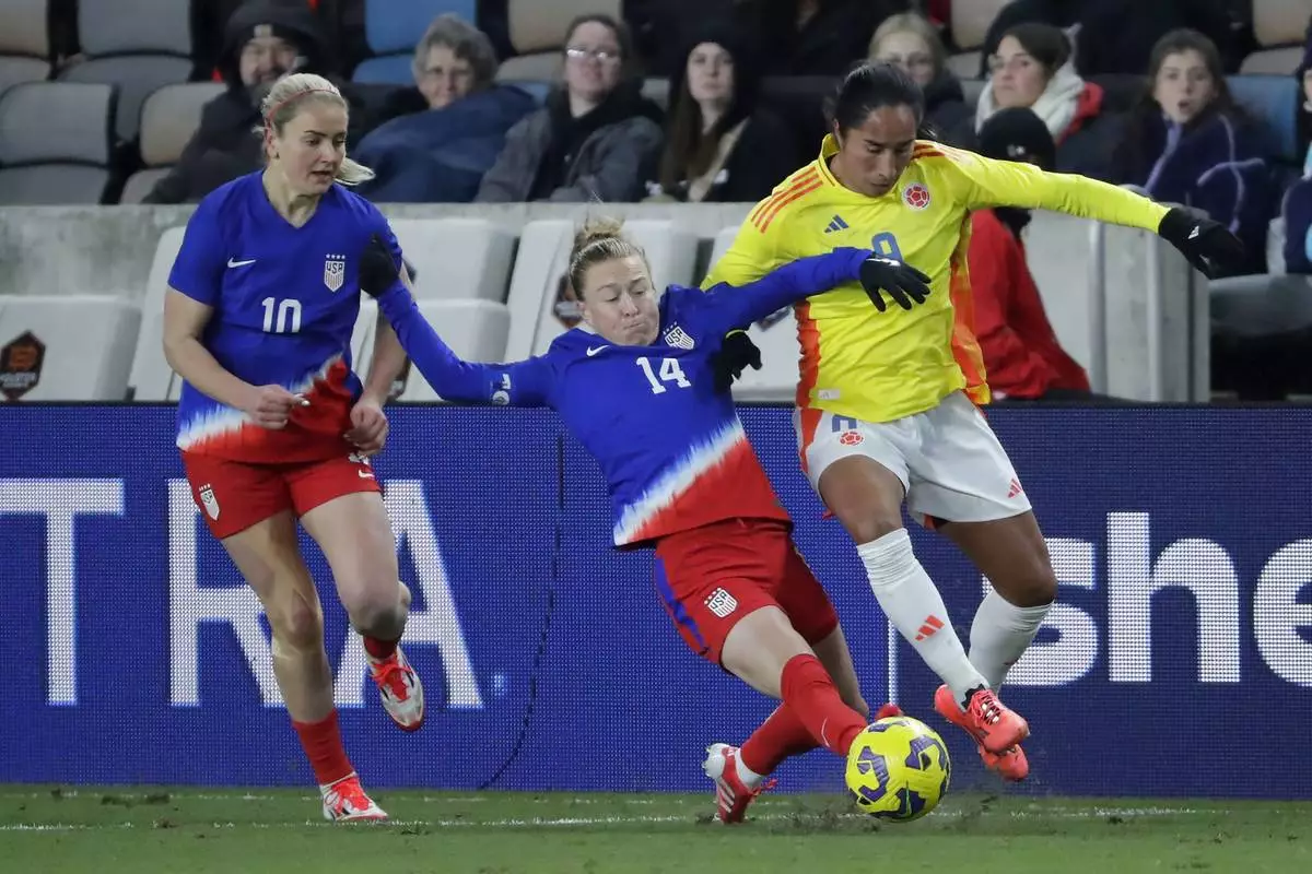 United States defender Emily Sonnett (14) slide tackles against Colombia forward Mayra Ramirez, right, as midfielder Lindsey Heaps (10) looks on during the SheBelieves Cup women's soccer tournament, Thursday, Feb. 20, 2025, in Houston. (AP Photo/Michael Wyke)