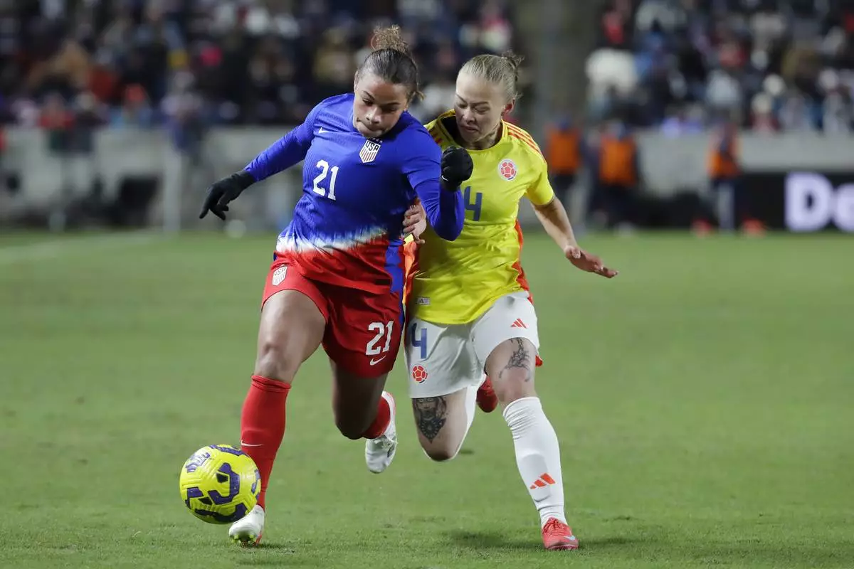 United States forward Michelle Cooper (21) moves the ball in front of Colombia defender Ana Guzman (4) during the SheBelieves Cup women's soccer tournament, Thursday, Feb. 20, 2025, in Houston. (AP Photo/Michael Wyke)