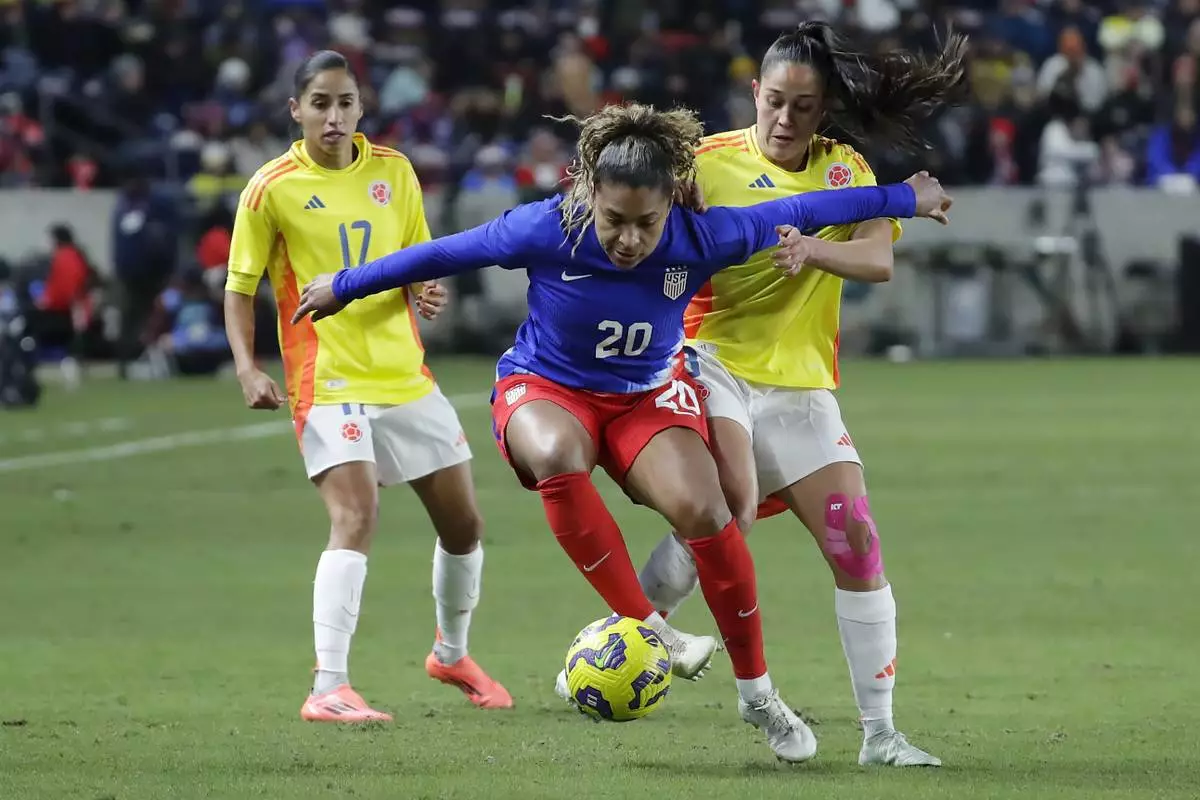 United States forward Catarina Macario (20) pushes between Colombia defender Carolina Arias (17) and midfielder Marcela Restrepo, right, during the SheBelieves Cup women's soccer tournament, Thursday, Feb. 20, 2025, in Houston. (AP Photo/Michael Wyke)
