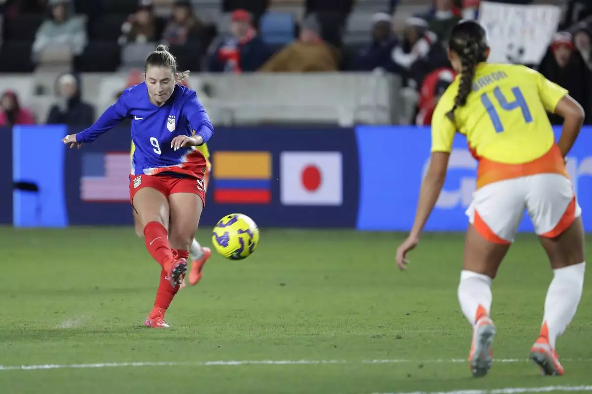 United States forward Ally Sentnor (9) gets her scoring goal kick past Colombia defender Angela Baron (14) during the SheBelieves Cup women's soccer tournament, Thursday, Feb. 20, 2025, in Houston. (AP Photo/Michael Wyke)