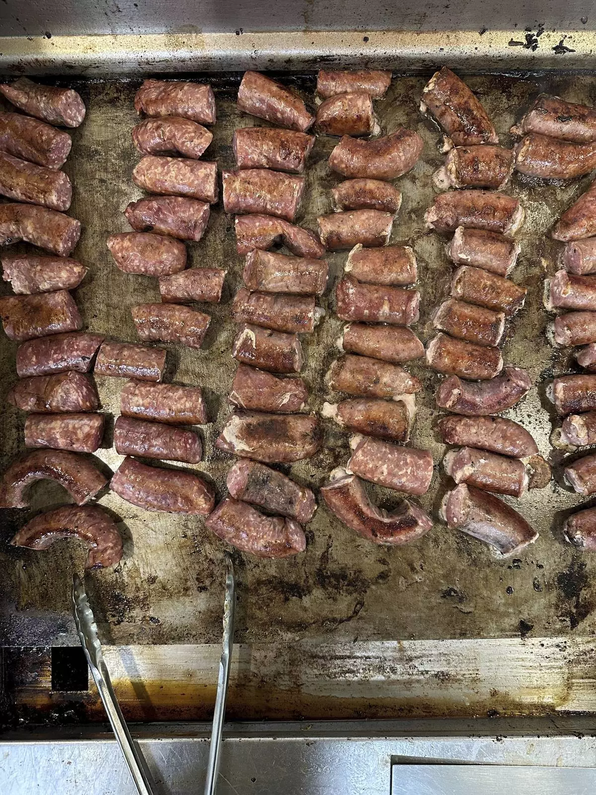 Servings of rabbit sausage cook on a fire hall griddle before a wild game dinner in Pine Grove, Pa., on Saturday, Feb. 15, 2025. (AP Photo/Tass Vejpongsa)