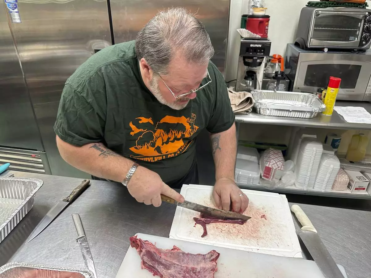 Event organizer Larry Primeau cuts up alligator, the "mystery meat," to serve at a wild game dinner in Pine Grove, Pa., on Saturday, Feb. 15, 2025. (AP Photo/Tass Vejpongsa)