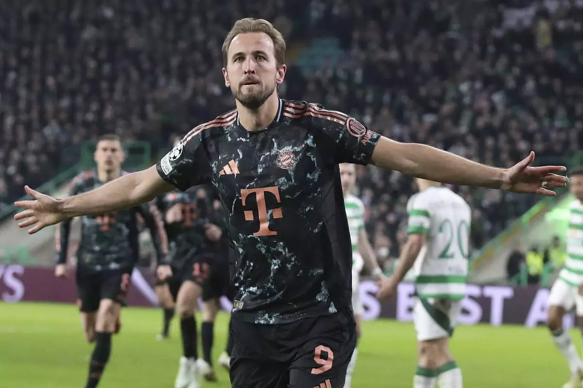 Bayern's Harry Kane celebrates after scoring his side's second goal during the Champions League play off first leg soccer match between Celtic Glasgow and Bayern Munich at the Celtic Park Stadium in Glasgow, Scotland, Wednesday, Feb. 12, 2025. (AP Photo/Scott Heppell)