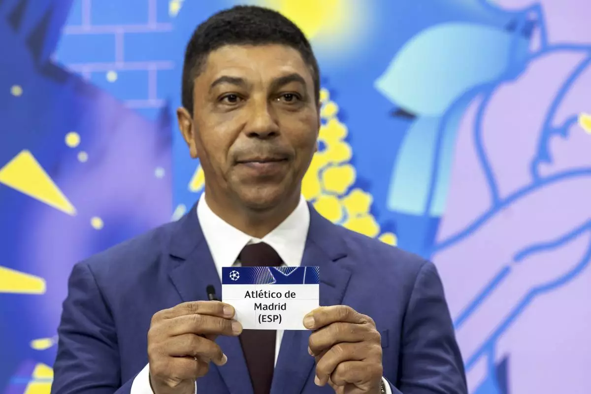 Brazilian former player Giovane Elber shows the ticket of Spanish club Atletico de Madrid, during the UEFA Champions League round of 16, quarter-final and semi-final draws, at the UEFA headquarters in Nyon, Switzerland, Friday, Feb. 21, 2025. (Salvatore Di Nolfi/Keystone via AP)