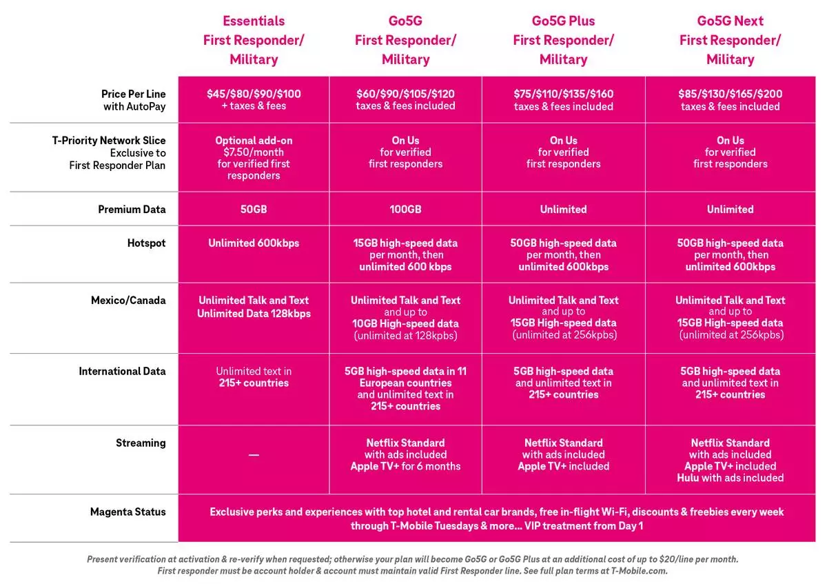 The new First Responder and Military Essentials plans include unlimited talk, text and data, unlimited texting in 215+ countries and destinations worldwide and exclusive benefits just for being customers with Magenta Status. That includes perks from top hotel and car rental brands, concert and movie tickets and access to the nation’s leading 5G network. Plus, those Essentials plan savings get even sweeter with deals to score a free 5G phone on Us with 24 monthly bill credits when joining the Un-carrier.