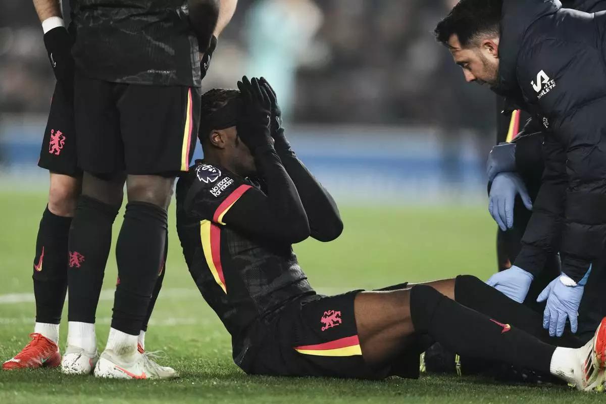 Chelsea's Noni Madueke reacts after an injury during the English Premier League soccer match between Brighton and Chelsea in Brighton, England, Friday, Feb. 14, 2025. (AP Photo/Dave Shopland)
