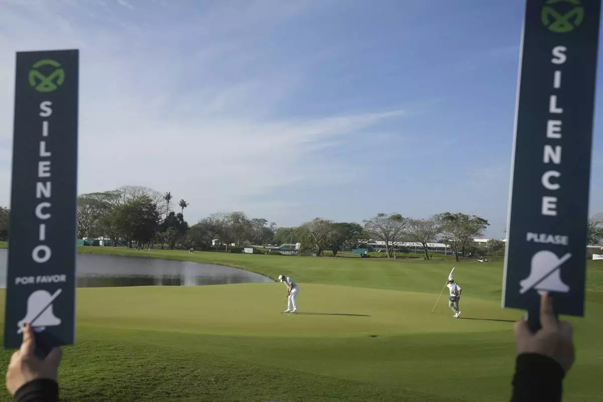 "Silence" signs are held up as Kaito Onishi, of Japan, watches his putt on the green of the first hole during the second round of the Mexico Open golf tournament in Puerto Vallarta, Mexico, Friday, Feb. 21, 2025. (AP Photo/Fernando Llano)