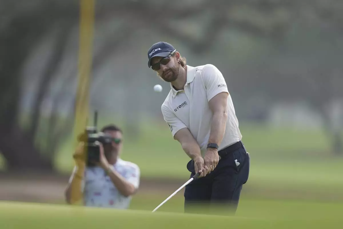 Patrick Rodgers, of the United States, chips onto the green of the 15th hole during the second round of the Mexico Open golf tournament in Puerto Vallarta, Mexico, Friday, Feb. 21, 2025. (AP Photo/Fernando Llano)
