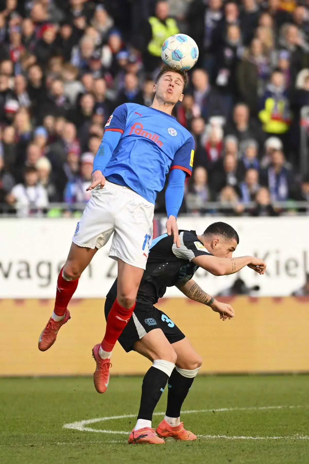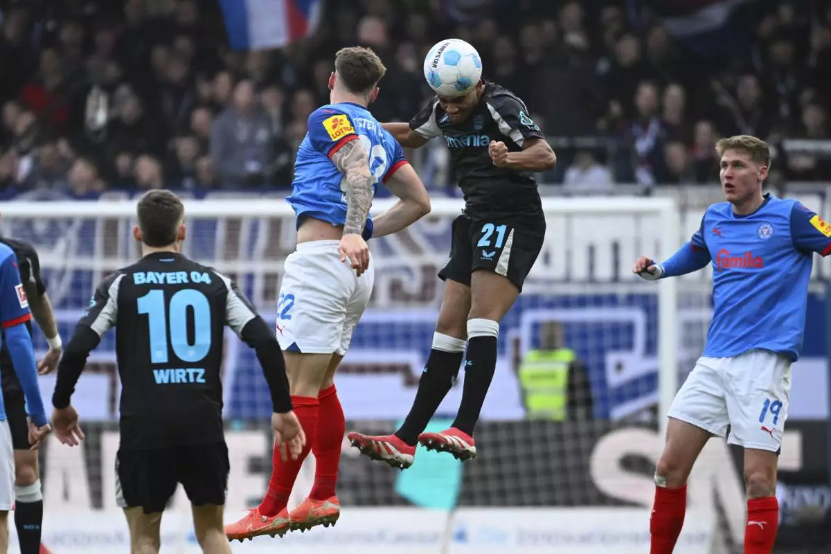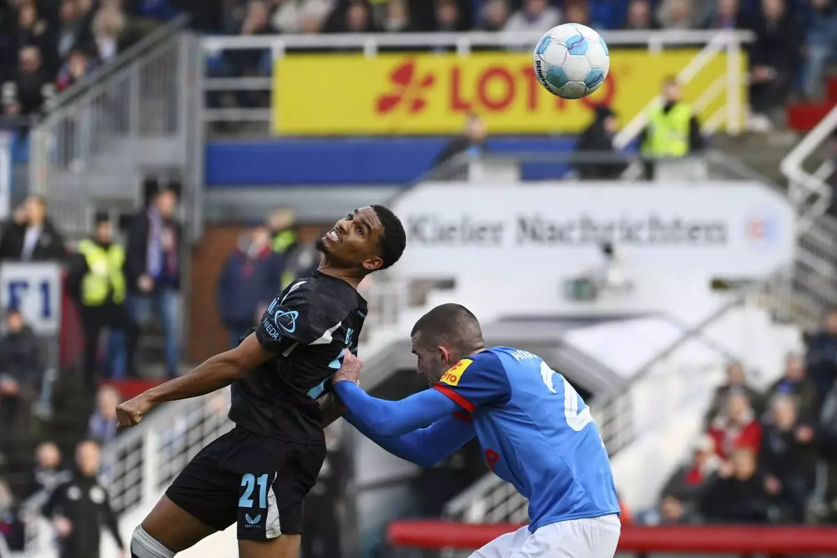 Leverkusen's Amine Adli, left, heads the ball over Kiel's David Zac during the Bundesliga soccer match between Holstein Kiel and Bayer Leverkusen at Holstein-Stadion, Kiel, Germany, Saturday Feb. 22, 2025. (Gregor Fischer/dpa via AP)