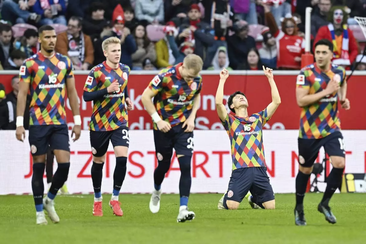 oalscorer Jae-Sung Lee, 2nd from right of Mainz celebrates a goal with teammates, during the German Bundesliga soccer match between 1. FSV Mainz 05 and FC St. Pauli in Mainz, Germany, Saturday, Feb. 22, 2025. (Uwe Anspach/dpa via AP)