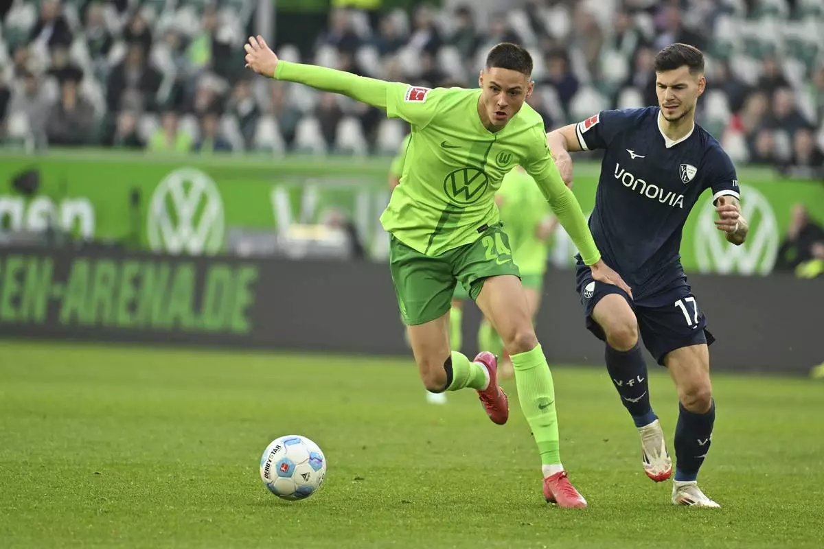 Wolfsburg's Bence Dardai, left, and Bochum's Tom Krauss in action during the Bundesliga soccer match between VfL Wolfsburg and VfL Bochum at Volkswagen Arena, Wolfsburg, Germany, Saturday Feb. 22, 2025. (Swen Pförtner/dpa via AP)