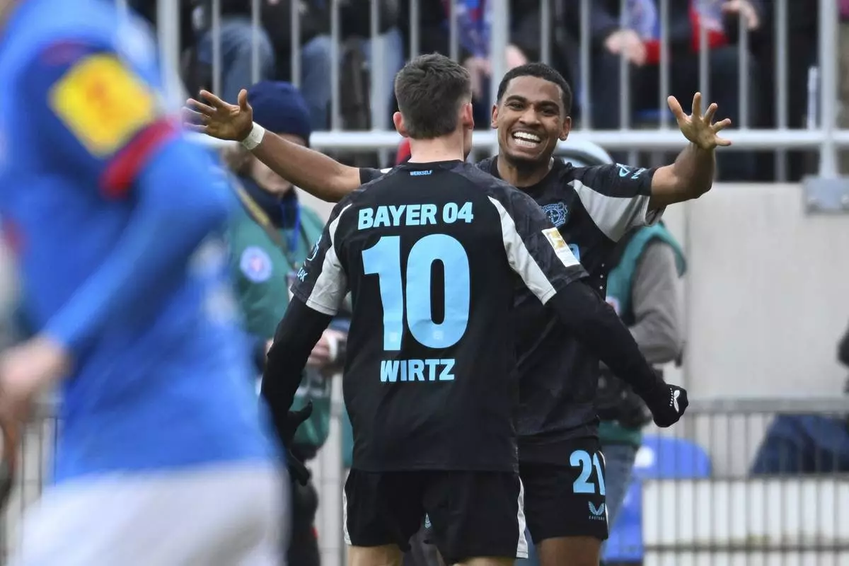 Leverkusen's Amine Adli, right, celebrates scoring with teammate Florian Wirtz during the Bundesliga soccer match between Holstein Kiel and Bayer Leverkusen at Holstein-Stadion, Kiel, Germany, Saturday Feb. 22, 2025. (Gregor Fischer/dpa via AP)