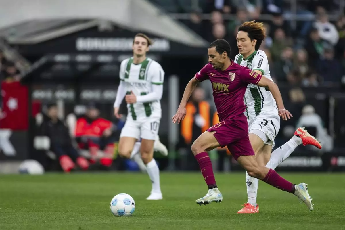 Augsburg's Alexis Claude-Maurice, left, and Gladbach's Ko Itakura fight for the ball during the German Bundesliga soccer match between Borussia Moenchengladbach and FC Augsburg in Moenchengladbach, Germany, Saturday, Feb. 22, 2025. (Marius Becker/dpa via AP)