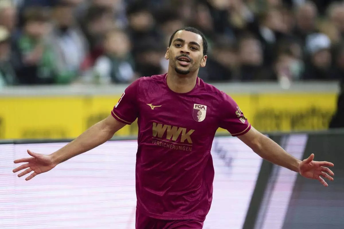 Augsburg's Alexis Claude-Maurice celebrates after scoring during the German Bundesliga soccer match between Borussia Moenchengladbach and FC Augsburg in Moenchengladbach, Germany, Saturday, Feb. 22, 2025. (Marius Becker/dpa via AP)