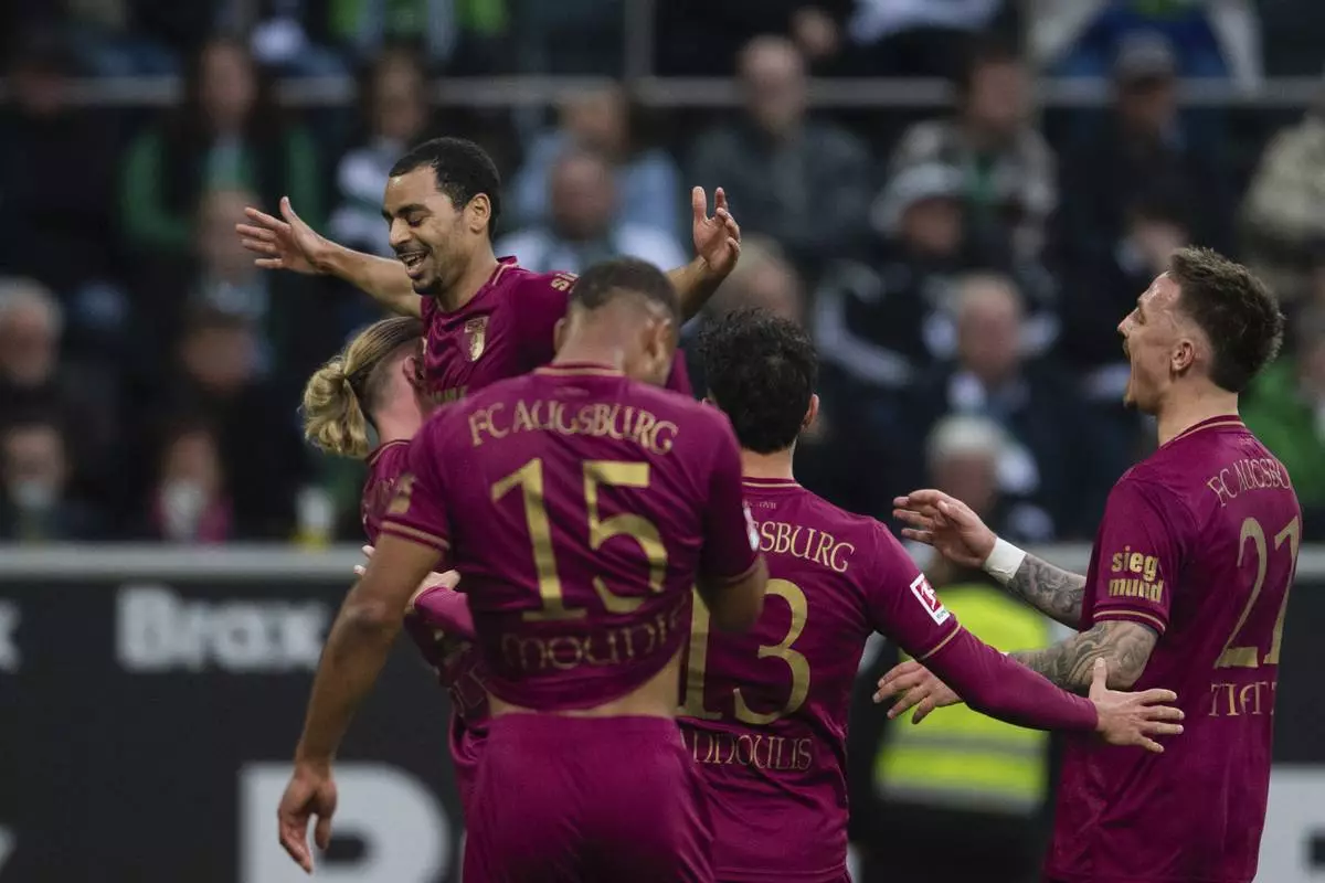 Augsburg's Alexis Claude-Maurice, second right, celebrates with teammates after scoring, with Moenchengladbach's Joe Scally in front, during the German Bundesliga soccer match between Borussia Moenchengladbach and FC Augsburg in Moenchengladbach, Germany, Saturday, Feb. 22, 2025. (Marius Becker/dpa via AP)