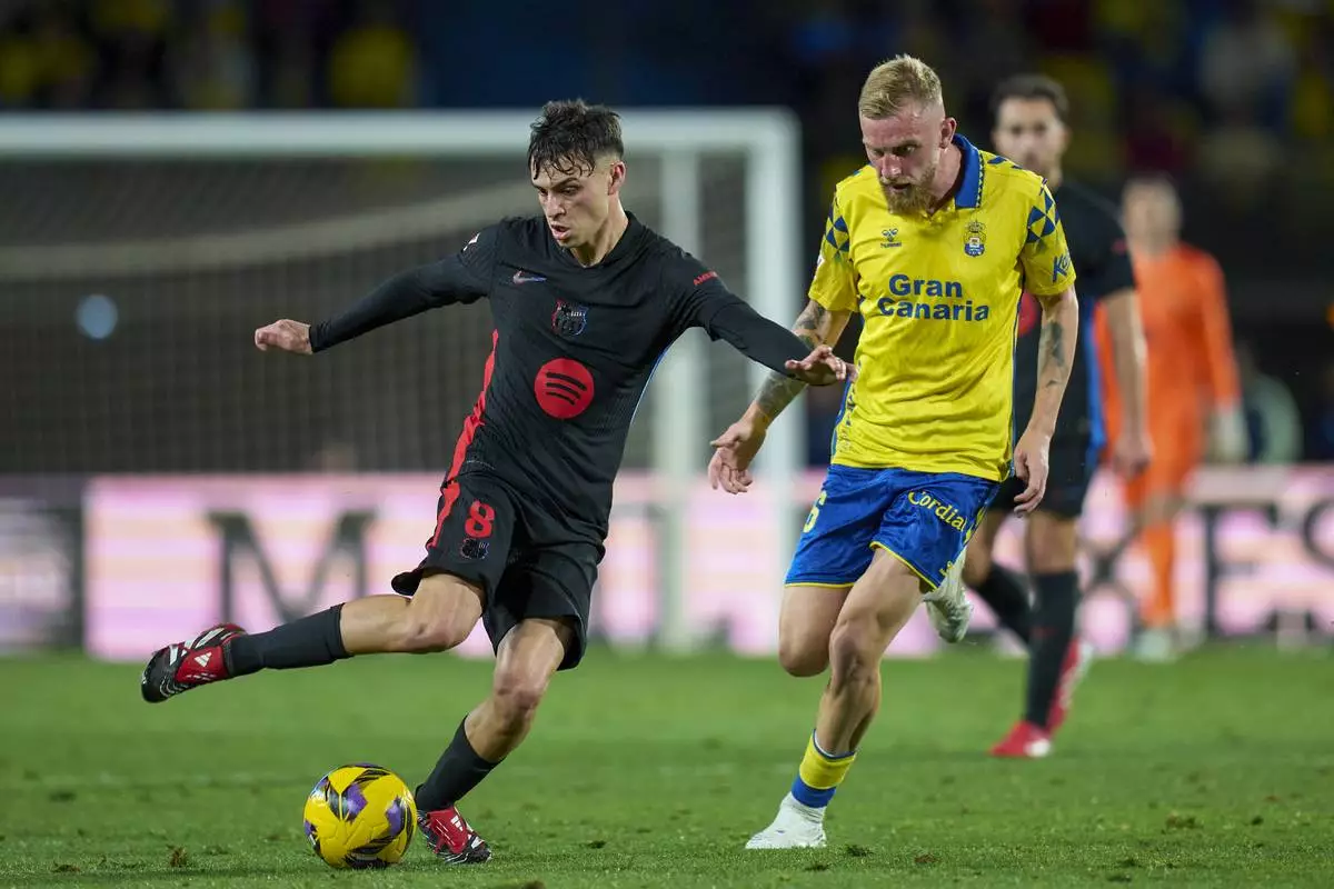 Barcelona's Pedri, left, duels for the ball with Las Palmas' Oli McBurie during the Spanish La Liga soccer match between Las Palmas and Barcelona at the Gran Canaria stadium in Las Palmas, Spain's Canary Islands, Saturday, Feb. 22, 2024. (AP Photo/Gabriel Jimenez)