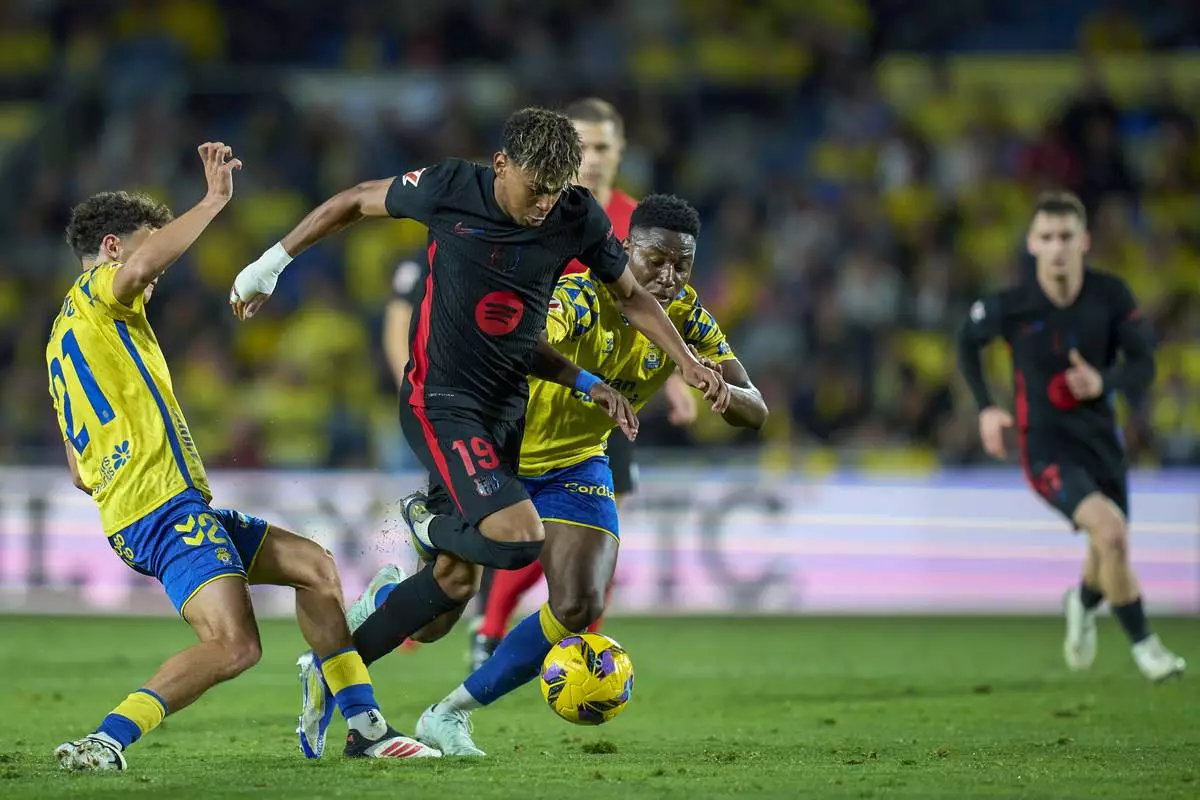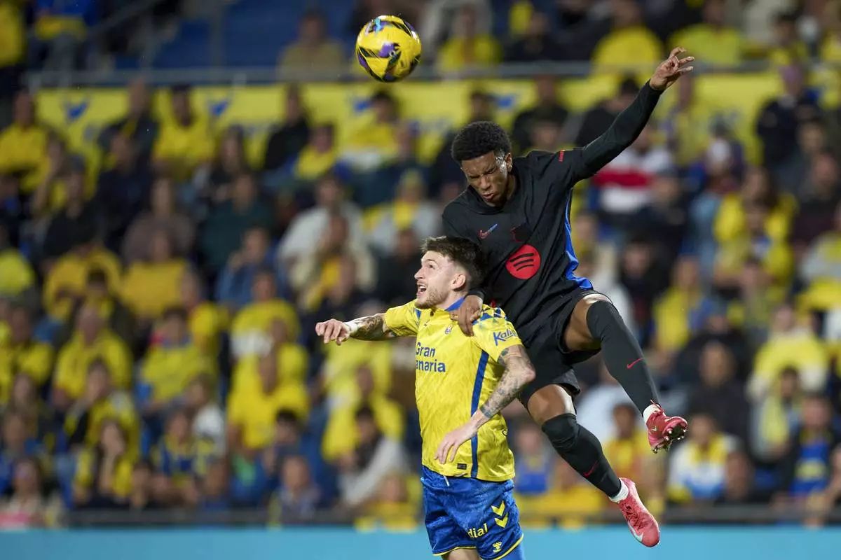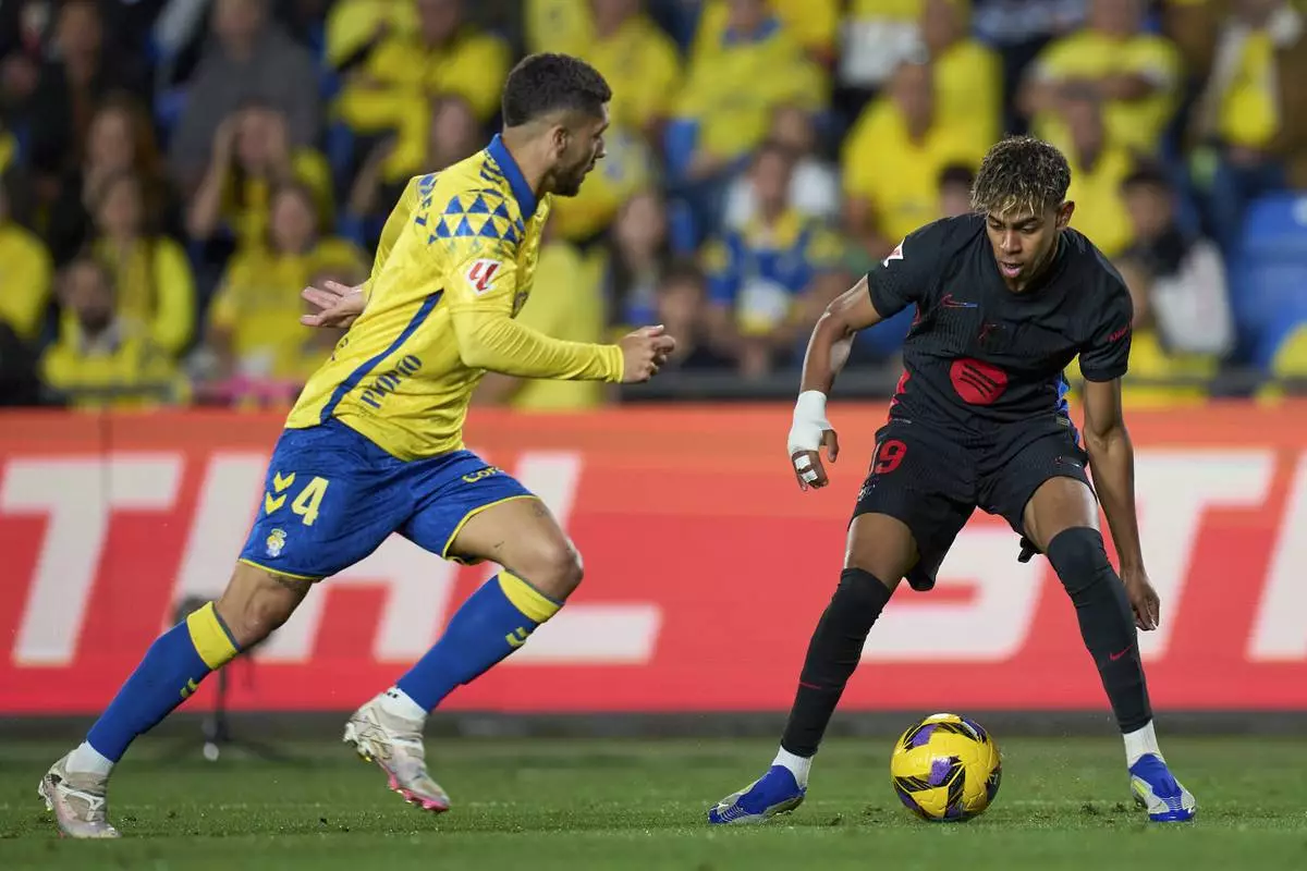 Barcelona's Lamine Yamal, right, duels for the ball with Las Palmas' Alex Suarez during the Spanish La Liga soccer match between Las Palmas and Barcelona at the Gran Canaria stadium in Las Palmas, Spain's Canary Islands, Saturday, Feb. 22, 2024. (AP Photo/Gabriel Jimenez)