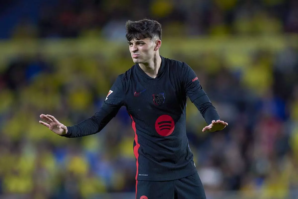 Barcelona's Pedri reacts during the Spanish La Liga soccer match between Las Palmas and Barcelona at the Gran Canaria stadium in Las Palmas, Spain's Canary Islands, Saturday, Feb. 22, 2024. (AP Photo/Gabriel Jimenez)