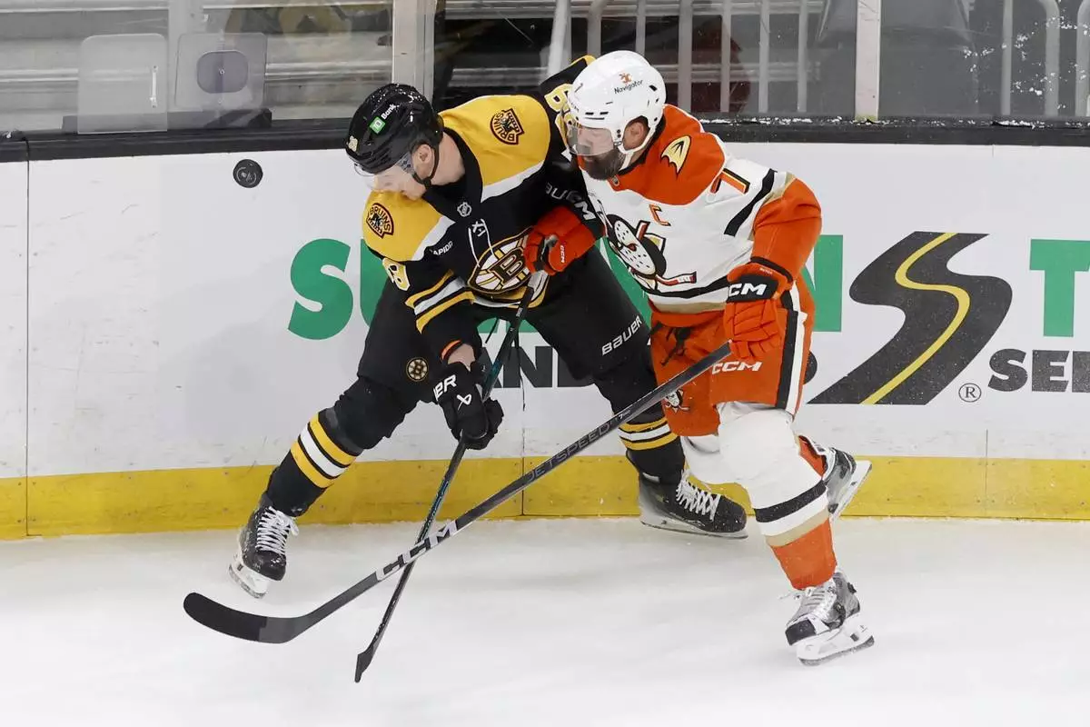Boston Bruins center Morgan Geekie, left, and Anaheim Ducks defenseman Radko Gudas (7) vie for the puck along the boards during the first period of an NHL hockey game, Saturday, Feb. 22, 2025, in Boston. (AP Photo/Mary Schwalm)