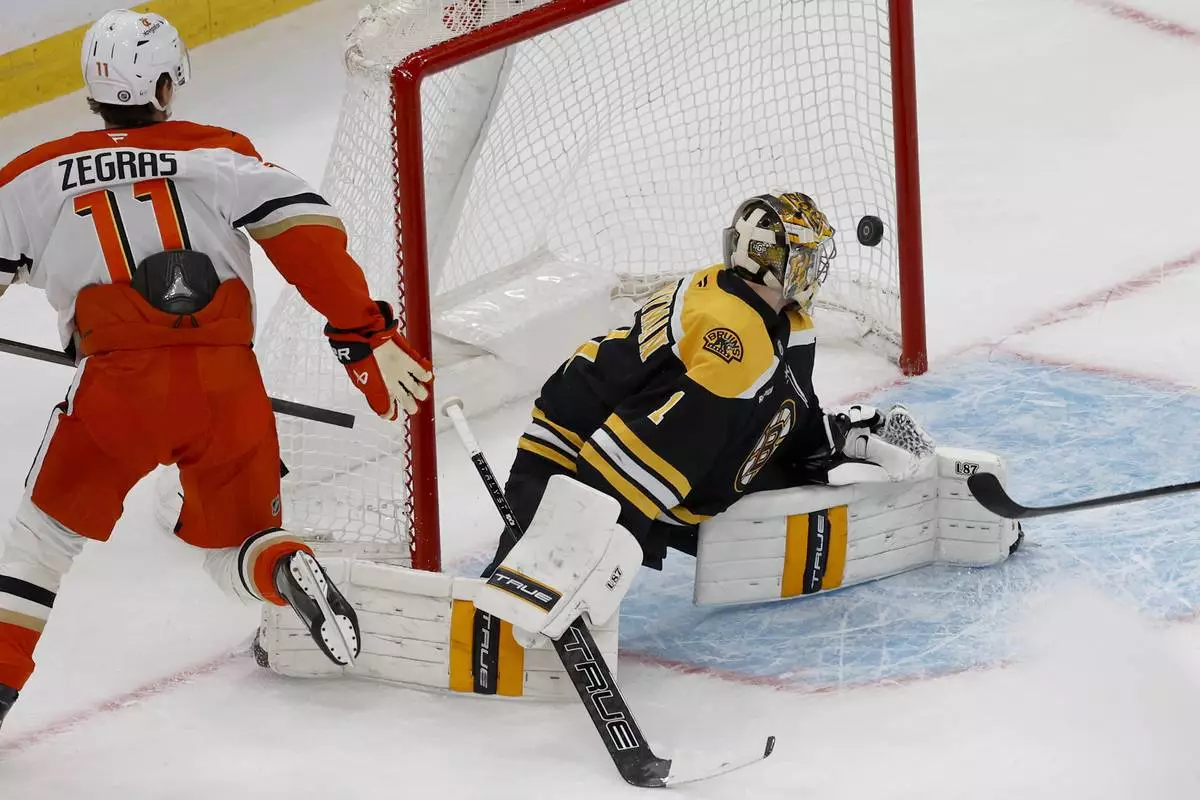 Anaheim Ducks center Trevor Zegras (11) scores past Boston Bruins goaltender Jeremy Swayman (1) during the first period of an NHL hockey game, Saturday, Feb. 22, 2025, in Boston. (AP Photo/Mary Schwalm)