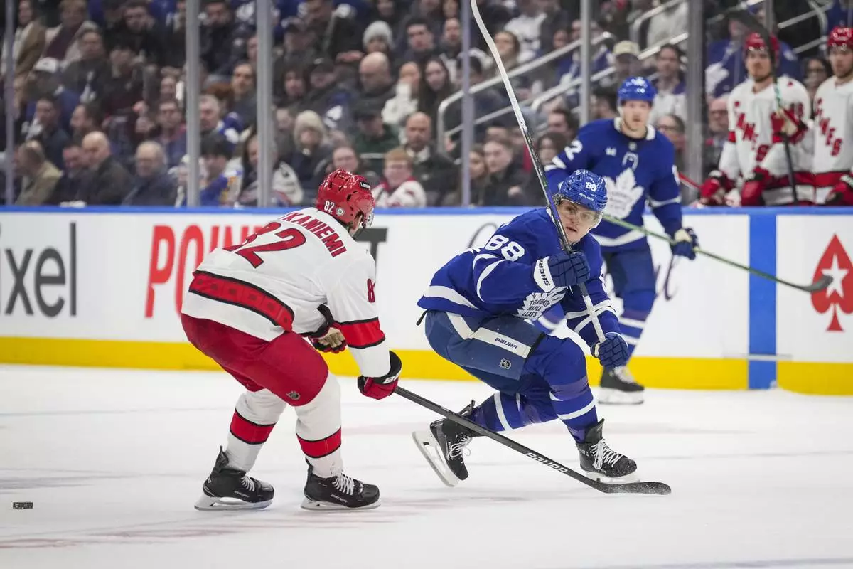 Toronto Maple Leafs right wing William Nylander (88) passes the puck away from Carolina Hurricanes centre Jesperi Kotkaniemi (82) during second period NHL hockey action in Toronto, Saturday, Feb. 22, 2025.(Arlyn McAdorey/The Canadian Press via AP)