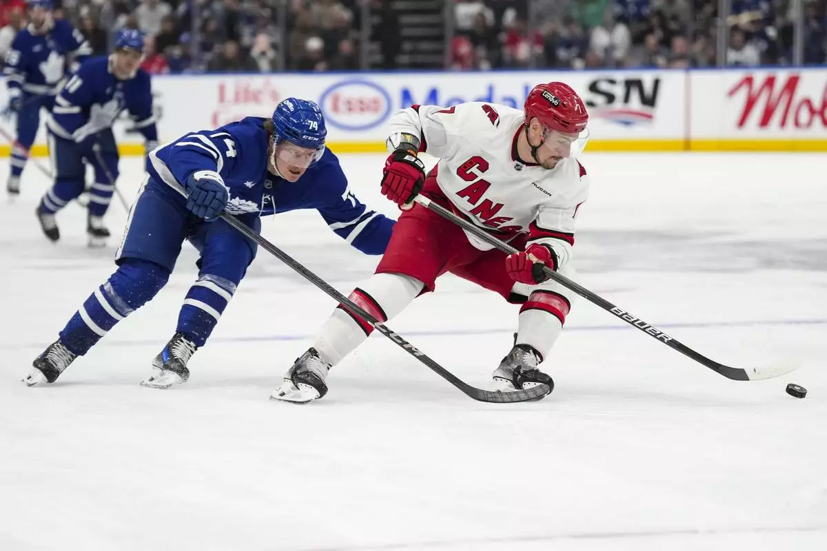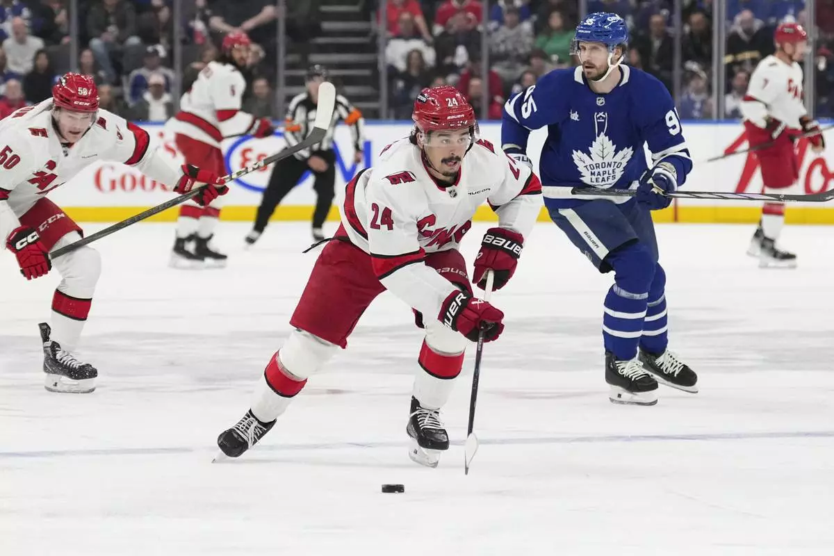 Carolina Hurricanes center Seth Jarvis (24) skates with the puck as Toronto Maple Leafs defenseman Oliver Ekman-Larsson (95) pursues during first-period NHL hockey game action in Toronto, Saturday, Feb. 22, 2025. (Arlyn McAdorey/The Canadian Press via AP)