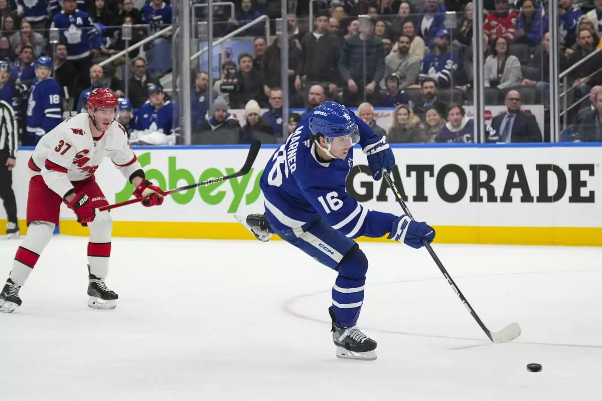 Toronto Maple Leafs right wing Mitch Marner (16) shoots while Carolina Hurricanes right wing Andrei Svechnikov (37) looks on during second-period NHL hockey game action in Toronto, Saturday, Feb. 22, 2025. (Arlyn McAdorey/The Canadian Press via AP)
