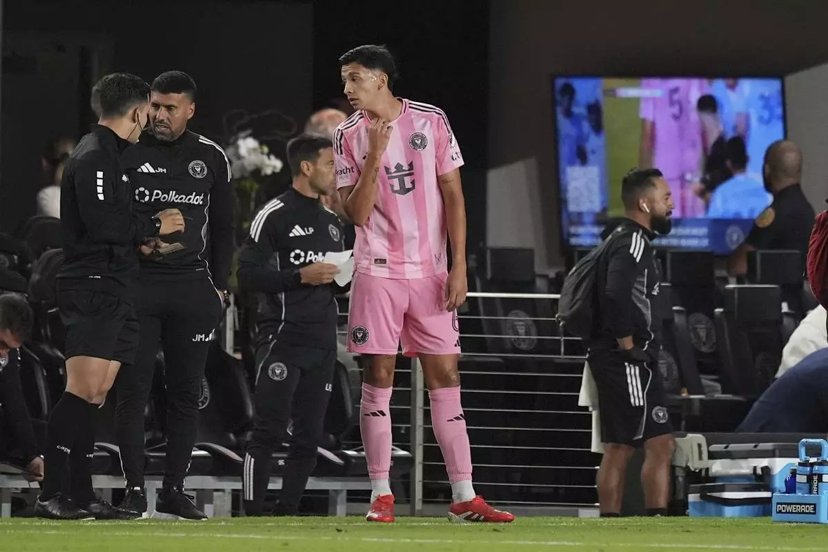Inter Miami midfielder Tomas Aviles (6) leaves the game after being shown a red card during the first half of an MLS soccer match against New York City FC, Saturday, Feb. 22, 2025, in Fort Lauderdale, Fla. (AP Photo/Rebecca Blackwell)