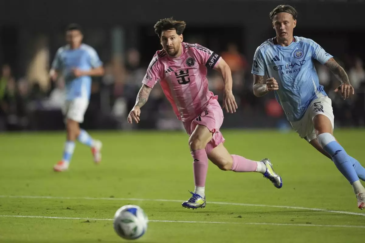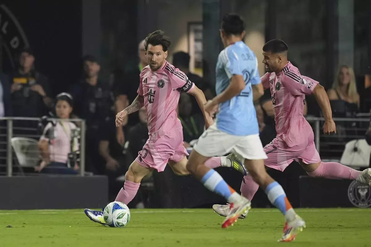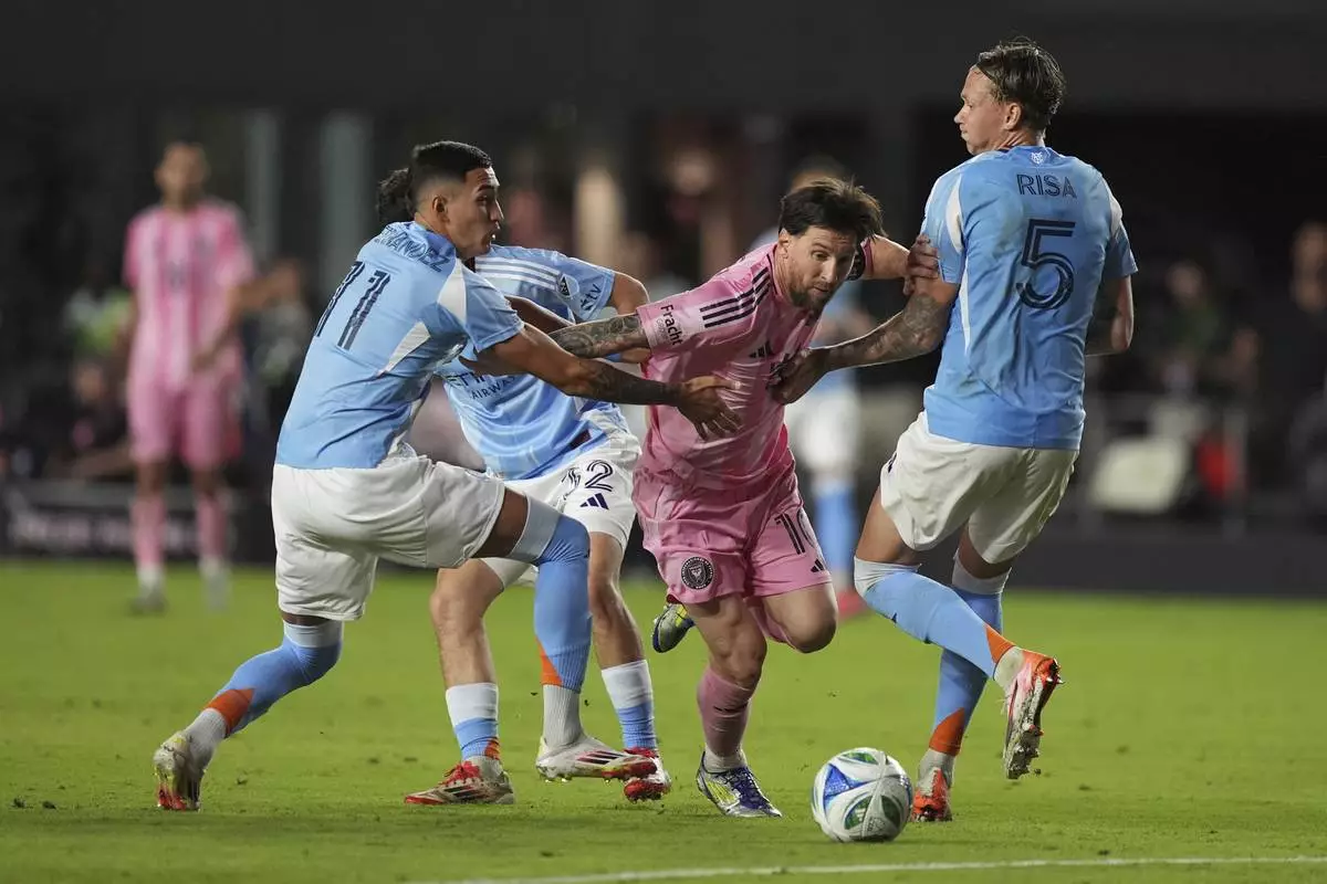 Inter Miami forward Lionel Messi comes under pressure from New York City FC defender Birk Risa (5) and forward Julian Fernandez as they battle during the second half of an MLS soccer match, Saturday, Feb. 22, 2025, in Fort Lauderdale, Fla. (AP Photo/Rebecca Blackwell)