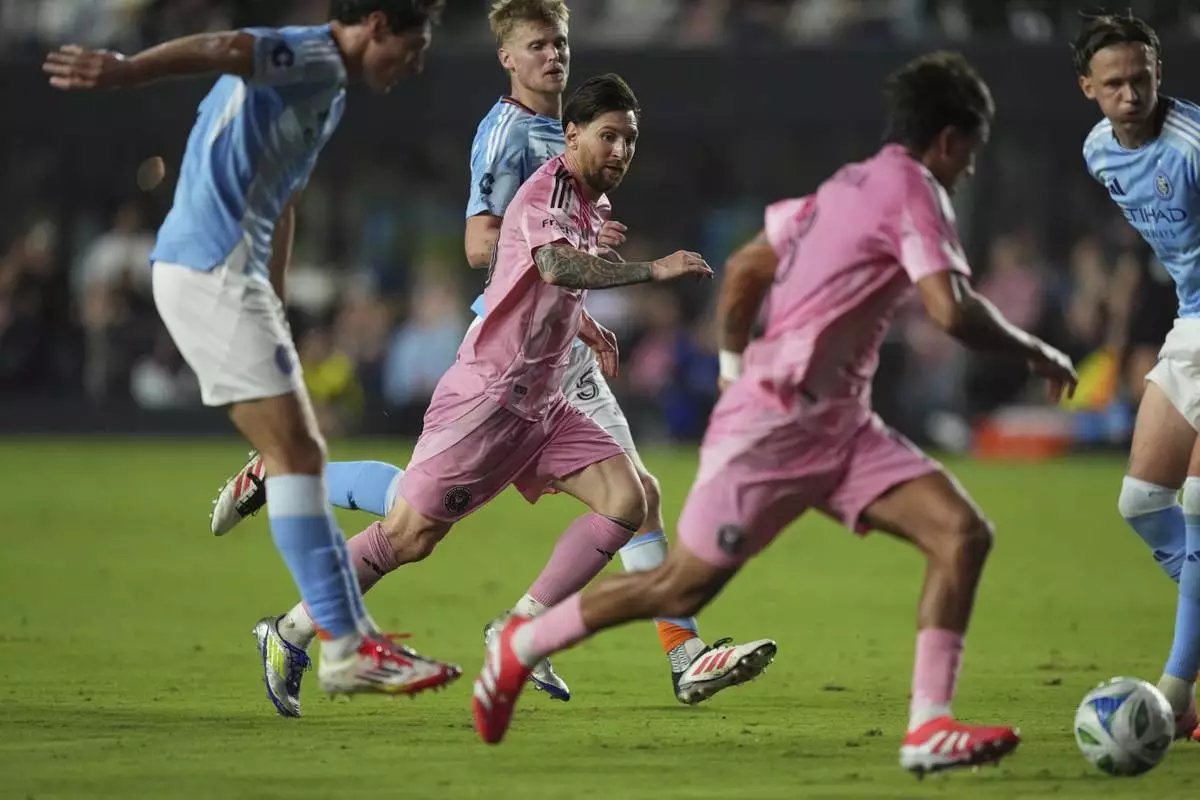 Inter Miami forward Lionel Messi, center, passes to midfielder Telasco Segovia to score the side's second goal against New York City FC, tying the game in the final minutes of stoppage time in their MLS soccer match, Saturday, Feb. 22, 2025, in Fort Lauderdale, Fla. (AP Photo/Rebecca Blackwell)