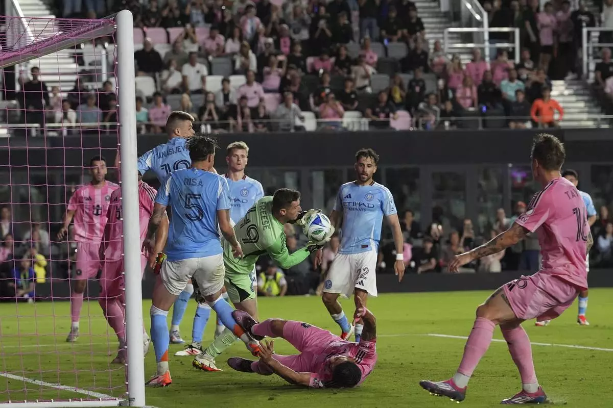 Inter Miami forward Lionel Messi (10) tries unsuccessfully to score, defended by New York City FC goalkeeper Matt Freese, right, and New York City FC midfielder Andres Perea (8) during the second half of an MLS soccer match, Saturday, Feb. 22, 2025, in Fort Lauderdale, Fla. (AP Photo/Rebecca Blackwell)